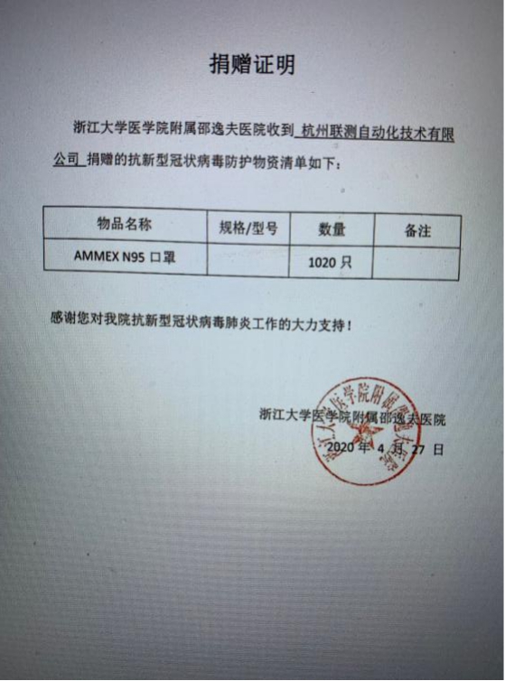 自新冠肺炎疫情爆發(fā)以來,杭州聯(lián)測(cè)自動(dòng)化有限公司累積向邵逸夫醫(yī)院捐贈(zèng)1020只N95醫(yī)用口罩,為當(dāng)?shù)氐目挂咭痪€的醫(yī)護(hù)人員提供一份保障。