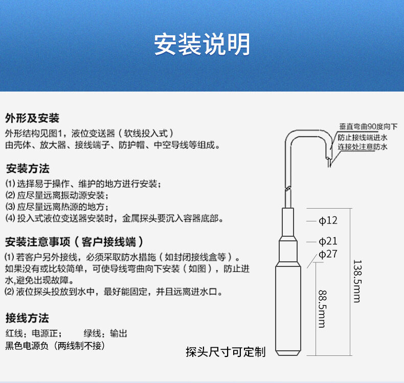 SIN-P260/P2600投入式液位變送器由高性能擴(kuò)散硅壓阻式壓力傳感器作為測量元件,把與液位深度成正比的液體靜壓力準(zhǔn)確測量出來,并經(jīng)過信號(hào)調(diào)理電路轉(zhuǎn)換成標(biāo)準(zhǔn)(電流或電壓)信號(hào)輸出,建立起輸出信號(hào)與液體深度的線性對(duì)應(yīng)關(guān)系,實(shí)現(xiàn)對(duì)液體深度的測量。